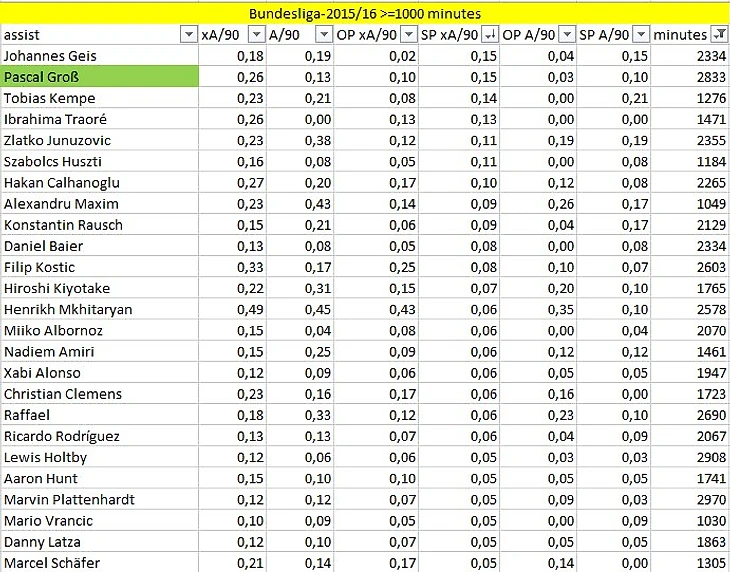 Два сезона подряд Гросс был в лидерах Бундес-1 по xA после стандартов – правда в обоих сезонах его партнеры по «Ингольштадту» андеперформили после его пасов, из-за чего оценить уровень Гросса можно было только посмотрев дальше строчки «ассисты» (кстати, в прошлом сезоне в топ затесался еще и Маркус Суттнер с 0,08 xA после стандартов – «Брайтон» взял и его, хотя тут стандарты вряд ли играли важную роль). Хорошие временные сэмплы - >2700 и >2800 минут соответственно так же крайне важны в данном случае.