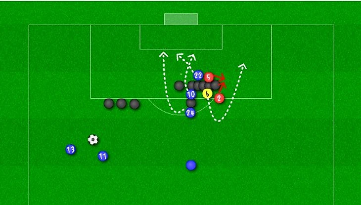 Первым делом бросился в глаза розыгрыш – симпатичная комбинация. У «Брайтона» два больших центральных защитника – Даффи и Данк, но здесь не было простого заброса за спину, как разыгрывают против подавляющего большинства команд, которые играют в линию 6-7 человек на штрафных с фланга. Стивенс (#6) сделал рывок по кривой с разворота за спину, Данк (#5) и Бруно (#2) поставили ему блоки (чтобы два крайних игрока в линии «Ньюкасла» не смогли помешать с комфортом сделать скидку), а Даффи (#22), Хемед (#10) и Проппер (#24) атаковали вратарскую с трех точек. Комбинация, явно отработанная на тренировках. Конечно, важным элементом является навес. Навес Паскаля Гросса. Вообще наличие двух разноногих подающих – большое подспорье для «Брайтона». Даже в этом эпизоде они угрожали и инсвингом, и аутсвингом – дополнительные неприятности для обороняющихся (для вратаря в том числе).