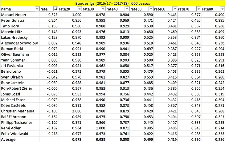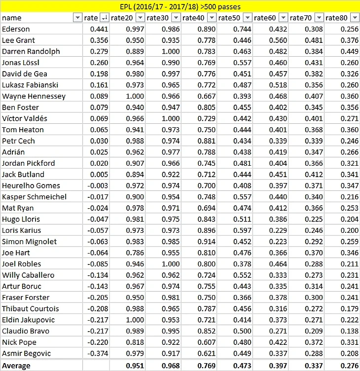 Чтобы внести чуть больше ясности, взял на вооружение такую методику: разбиваем поле на зоны по радиусу от центра ворот (именно радиусу, а не горизонтальным линиям, чтобы адекватно оценивались передачи во фланги) – (0-20; 20-30; 30-40; 40-50; 50-60; 60-70; 70-80), исключая совсем уж шальные передачи на >80 метров. Считаем точность для каждого вратаря в каждой зоне, а потом выводим такой рейтинг: (PASSi [0-20) – averagePASS [0-20))+(PASSi [20-30) – averagePASS [20-30))+….+(PASSi [70-80] – averagePASS [70-80]) – по сути, сумма отклонений от среднего, то есть величина без какого-то особого физического смысла, но при этом вратари с разной структурой кластеров передач уже могут более-менее сравниваться напрямую.