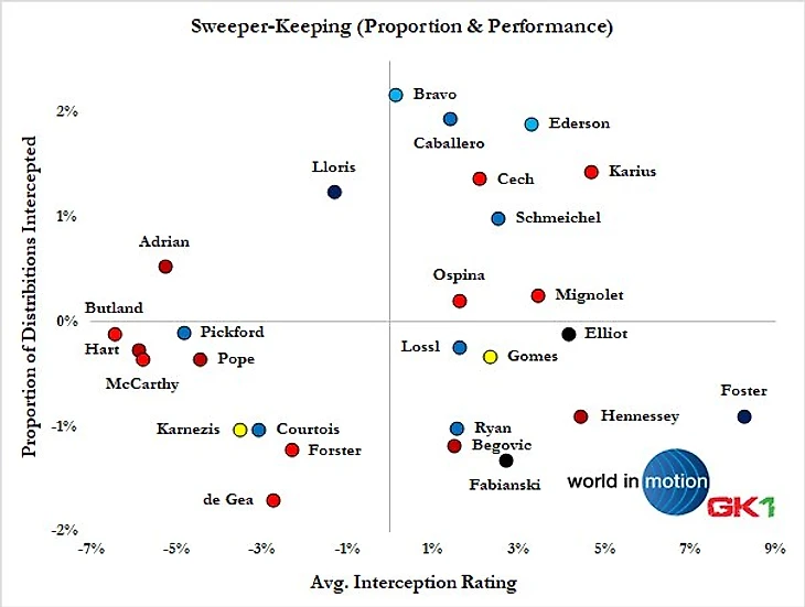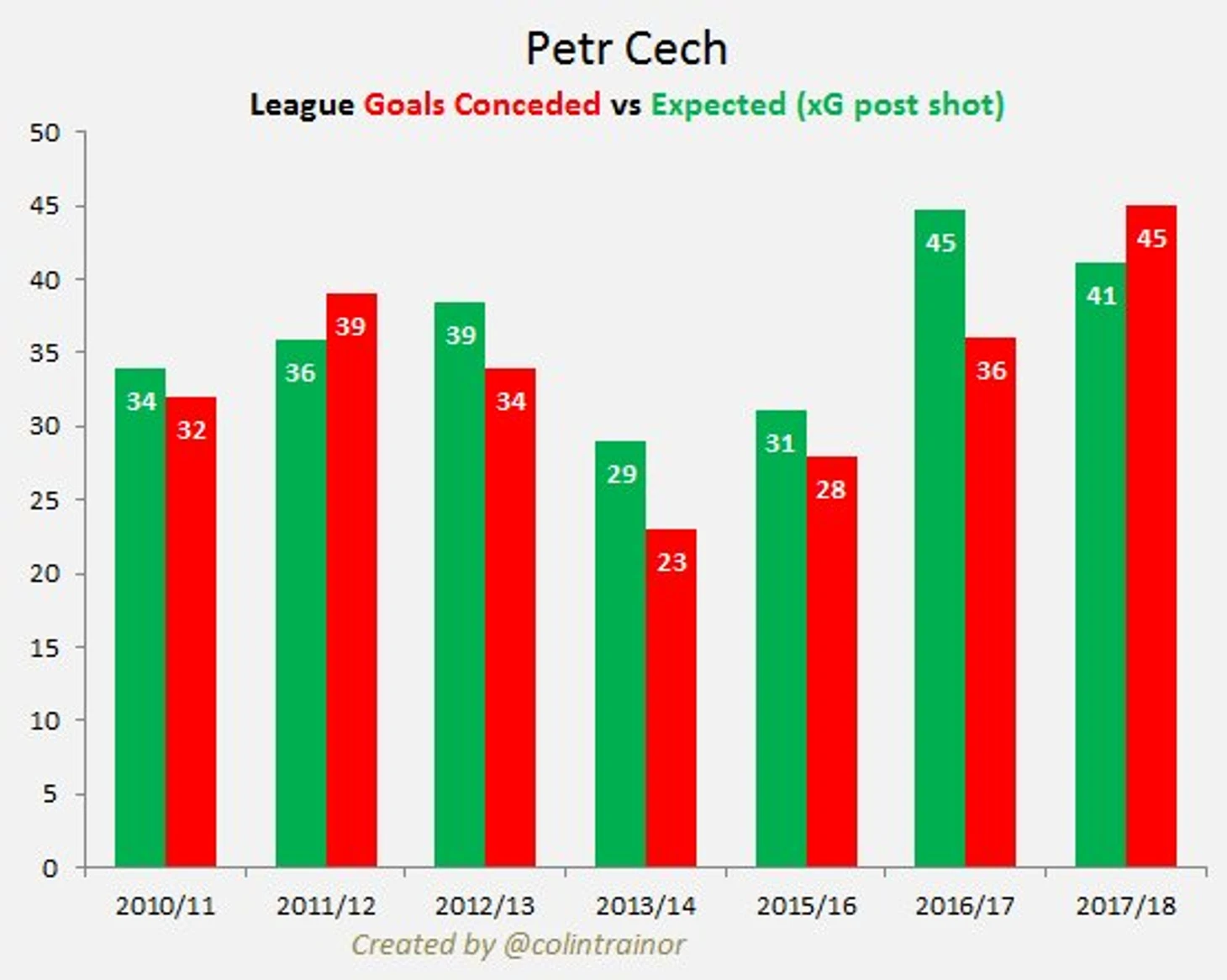 В команде Эмери вратарь очевидно должен быстро реагировать на забросы за спину защиты и уметь подчищать. Иначе быть не может при стиле с игрой во владение и интенсивным прессингом, о которых тренер заявил на первой пресс-конференции. Если в плане данных, оценивающих отражение ударов, мы уже практически уронили Запад, то такие вещи, как подстраховка защитников (sweeper-keeping) до сих пор вызывают сложности, поскольку для этого необходимо отсматривать самостоятельно каждый такой момент. Для этого нет возможности, поэтому сошлюсь на Сэма Джексона, который занимается этим для своего вратарского консалтингового агентства. По его данным, Чех в сезоне-2017/18 лучше среднего подстраховывал своих защитников при забросах за спину