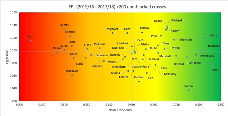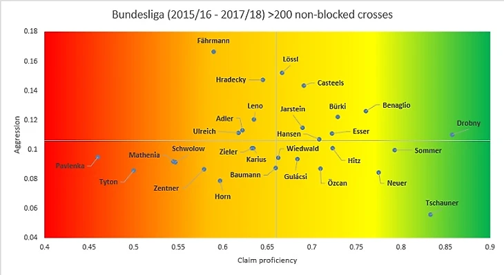 Выше данные за три последних полных сезона в АПЛ и бундеслиге. Неплохо видно, что средние значения по обоим показателям похожи в обоих лигах. Чех – средний в смысле агрессивности и на статистически незначимую величину имеет claim proficiency выше среднего по АПЛ.