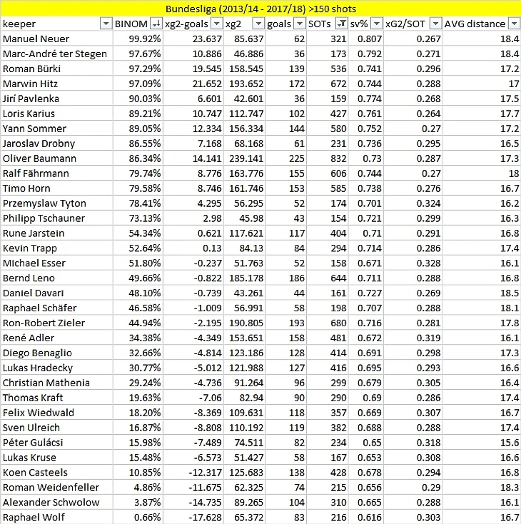Для того, чтобы избавиться от недостатков каждого из методов рассчитаем вероятность того, что средний вратарь пропустит больше голов (без учета ударов с пенальти), чем выбранный (BINOM – название от того, что в расчетах используются соответствующие пики биноминального распределения) – с данного количества ударов, количества голов и среднего качества этих ударов (такой алгоритм показывает схожие результаты с методом Монте-Карло).