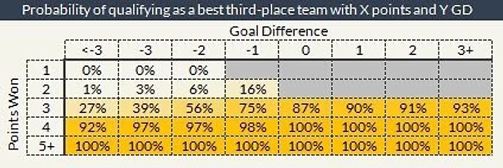 Прикрепляю еще две картинки. Первая с вероятностью выйти из группы с определенным количеством очков и разницей мячей. Важно - положение дел дано на начало турнира без учета сил команд. Взята из твиттера @OmarChaudhuri. На второй - вероятность выхода третьих команд из определенных комбинаций групп по состоянию на конец матча испанцев (@Futbolmetrix1). Можно заметить, что вероятность выхода третьей команды из группы B равна 89%.