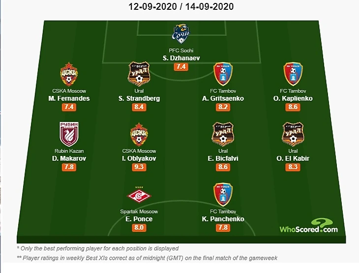 Портал Whoscored опубликовал традиционную символическую сборную по итогам седьмого тура РПЛ.