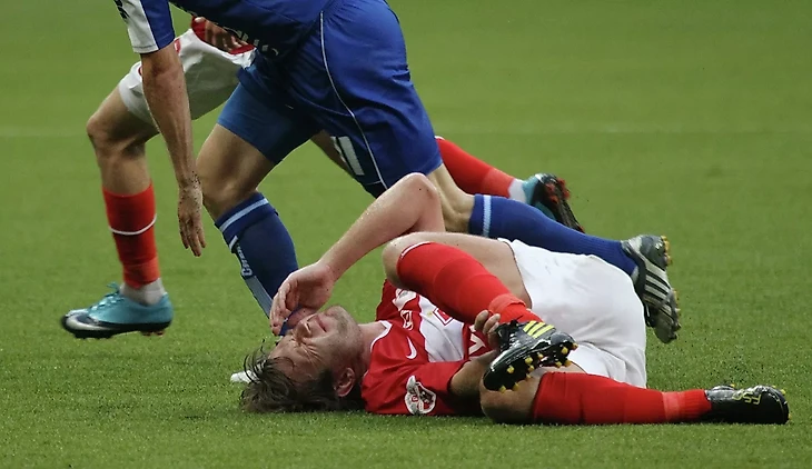 Футбол. РФПЛ. Матч «Спартак» — «Сибирь». Иван Саенко лежит на газоне