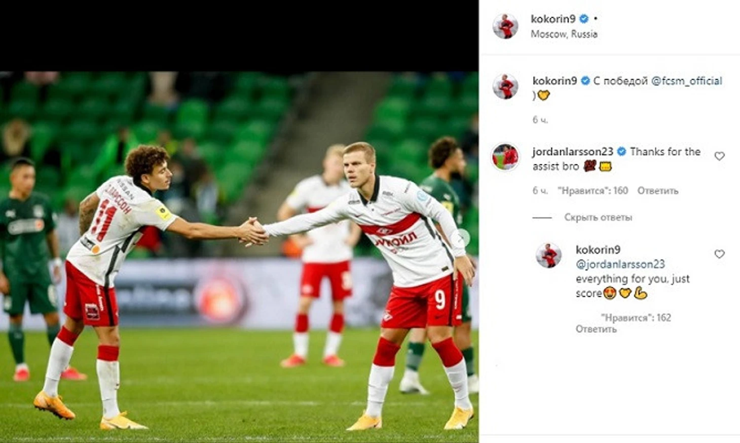 «С победой, «Спартак», — написал Кокорин. «Спасибо за голевую передачу, бро», — написал в комментариях Ларссон. «Всё для тебя, просто забивай», — ответил ему Александр. Счёт был открыт на 13-й минуте матча. Эсекьель Понсе продавил защитника и пробил в противоход Матвею Сафонову. На 33-й минуте «Спартак» удвоил преимущество. Виктор Мозес на замахе убрал защитника и аккуратно положил мяч в дальний угол. Во втором тайме «Краснодару» удалось сократить отставание усилиями Леона Сабуа. На 81-й минуте красно-белые установили итоговый счёт встречи. Ларссон забил с передачи Кокорина. Таким образом, красно-белые стали единоличными лидерами в турнирной таблице, набрав 27 очков. «Краснодар» (18) — на 8-м месте.