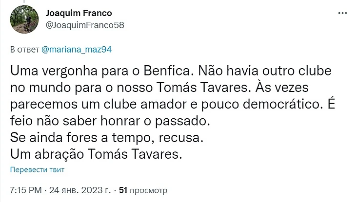 💭 «Позор для «Бенфики». Для нашего Томаша Тавареша не нашлось другого клуба? Иногда мы выглядим любительским и недемократическим клубом. Ужасно, что не чтим прошлое. Если у вас еще есть время — откажитесь! Крепко обнимаю Томаша Тавареша».