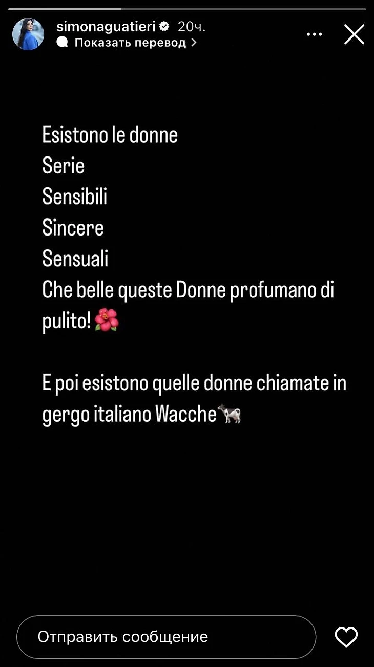 «Есть женщины. Серьезные. Чувствительные. Честные. Эти женщины пахнут чистотой. А есть и Wacchi (корова по-итальянски. Вообще слово пишется как vacchi, но Симона намеренно изменила первую букву, так как имя Ванды пишется как Wanda)».