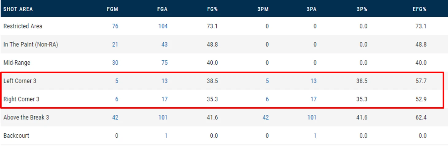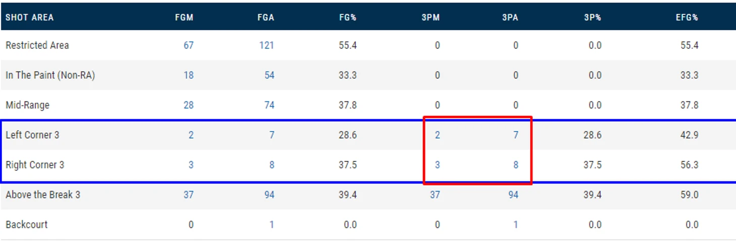 В очных матчах у них 15 бросков из углов, по 2 или чуть меньше за игру. То есть, за 48 минут у них 2 броска оттуда... но аж 94 отсюда!