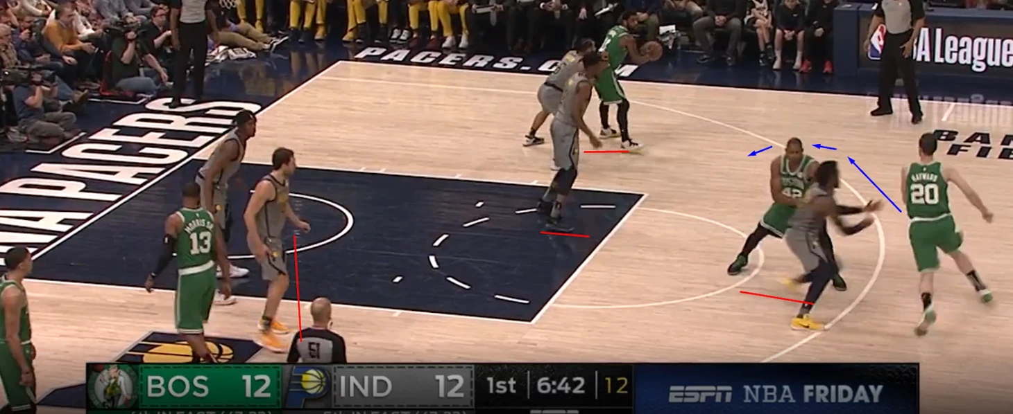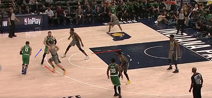 Например как здесь, Тейтум играет с Богдановичем, Хорфорд его блокирует, а Тернер отходит в краску опасаясь прохода.