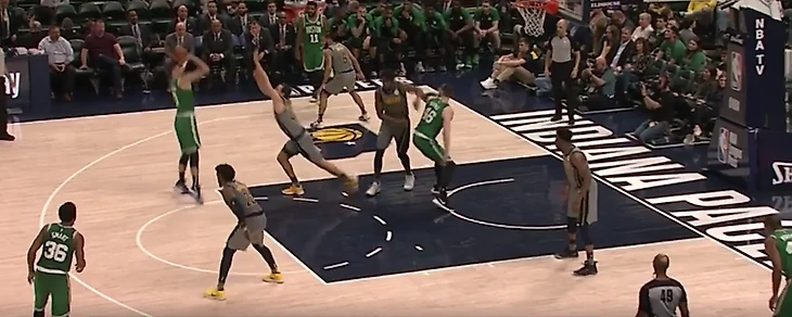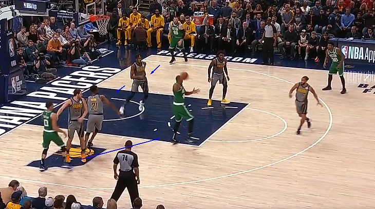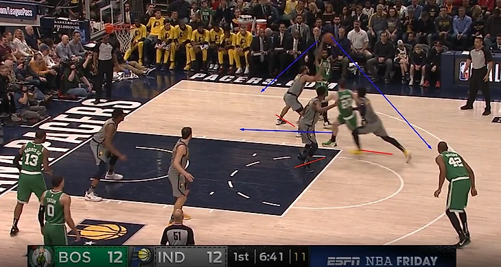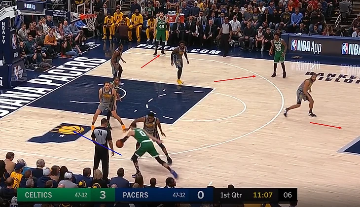 Проблема Индианы в том, что они не могут подстраховывать друг друга, Браун кидает трешки с 34.4%, Тейтум - 37.3% Моррис - 37.5%, Хорфорд -36%, и тд. На скринев видно что Янг не идет высоко прессинговать Ирвинга, потому что после заслона он от него легко бы убежал, а крайние защитники не смогли бы прийти на помощь потому что Кайри сразу адресовал бы пас в освободившееся место. Это оставило Кайри 1 на 1 с Янгом наверху краски, здесь он уже выбирал бросать открытый средний или прорваться на скорости под кольцо или в район кольца и кинуть, выбрал он второе, и закинул.