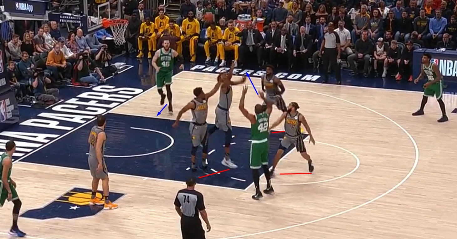 Богданович вышел на Тейтума, тот перекинул мяч Хорфоду в краску, это вынуждает Тернера бросать Бейнса и перекрывать Эла, ведь Янг с Богдановичем отыграны.