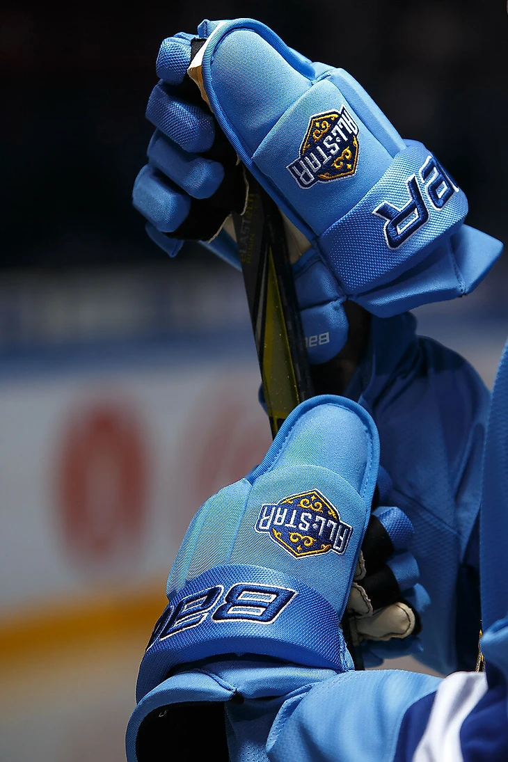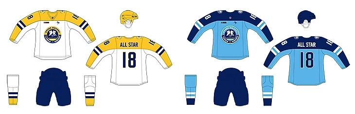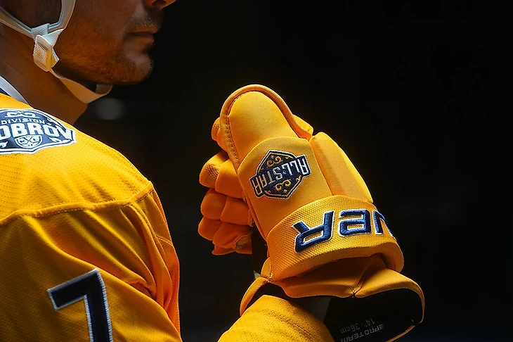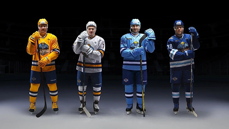 Как я уже говорил, Матч звезд обладает редким сочетанием цветов. К стандартным можно отнести синий комплект, но с оговоркой, что чистый «блю» не особо распространен в лиге, клубы предпочитают более темный «Нэви блю». Единственная голубая форма КХЛ – у «Сибири». Желтого клуба в КХЛ нет давно, многие уже соскучились по яркому ячменно-желтому «Атланту». К стандартным цветам можно отнести и белый комплект, но даже он смотрится оригинально за счет спецзаказа однотонных краг в цвет и шлемов. В целом этот тезис касается всех форм Матча звезд, спецзаказ экипировки придает им свежие черты.