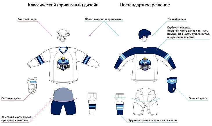 Мне нравится выводить проекты за рамки стандартных решений. Например, одна из моих давних идей — сделать шнурки коньков частью цветового гайда формы. В рамках Недели звезд это сделать проще всего. Еще совсем недавно перчатки на Матчах звезд не считались частью формы, все выступали в клубных. Также можно прокачать и шнурки.