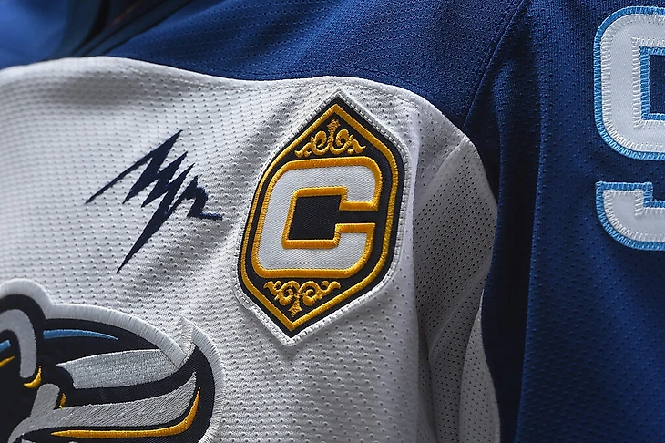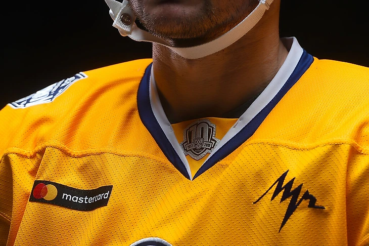 На джерси КХЛ получалось много всего: логотипы дивизионов, эмблемы клубов, реклама Мастеркарда, шеврон юбилейного сезона КХЛ, значок «Луча» на груди, капитанские литеры. Чтобы оставить больше пространства, значок КХЛ на островке воротника мы заменили миниатюрным жаккардовым шевроном юбилейного сезона, а также обратились к оптимальной асимметричной схеме размещения логотипов: на одном плече дивизион, на другом клуб. К слову, мы всерьез рассматривали вариант с хромафлексовым юбилейным логотипом. Учитывая, что отечественное качество вышивки в малых размерах не выдерживает никакой критики, в будущем эта технология может появиться на джемперах КХЛ.