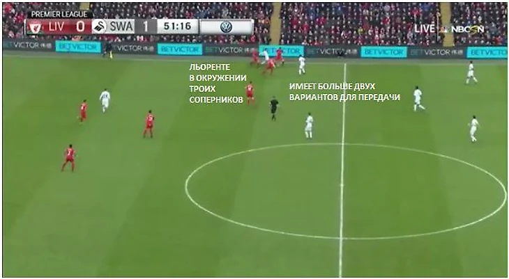 В указанном эпизоде Льоренте сместился с мячом на правый фланг после того, как "Ливерпуль" потерял владение около собственной штрафной. Трое футболистов в красной форме надеются отобрать мяч у испанца, но в то же время у нападающего есть ряд вариантов - трое игроков находятся неподалеку, хоть и за центральной линией, рядом хавбек. Количество этих вариантов, несмотря на прессинг, не уменьшилось, а значит, вернуть контроль путем давления не выйдет.