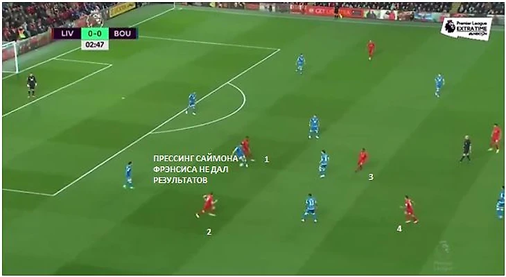 Такое в матчах мерсисайдцев случается довольно часто и на чужой половине поля, когда соперники сидят глубоко в защите. Имея численное преимущество, оттягиваясь двумя линиями по 4 футболиста, они спокойно уходят из-под прессинга, контролируя мяч.