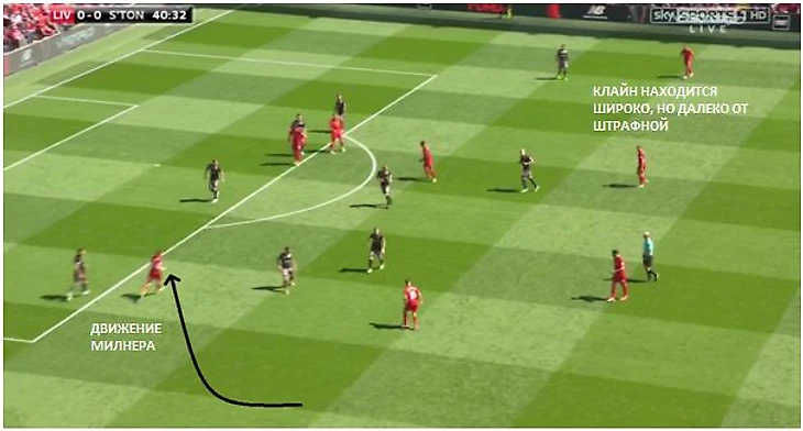 Пять минут до перерыва. Гости откровенно отдали мяч "красным", надеясь исключительно на контратаки. Коутинью владеет мячом, но почти все его потенциальные адресаты расположились в центре около штрафной, в результате бразилец занимается поиском более простого варианта поблизости. При этом Джеймс Милнер, вместо того, чтобы растягивать эту плотность забеганием на фланг, тоже смещается к центру. Нельзя винить его в такой футбольной мысли - он не классический латераль, но на противоположном фланге крайний защитник Клайн, который рожден для этой роли, остается глубоко, не стремясь к тому, чтобы искать среднюю передачу забегом за спину Буффала.