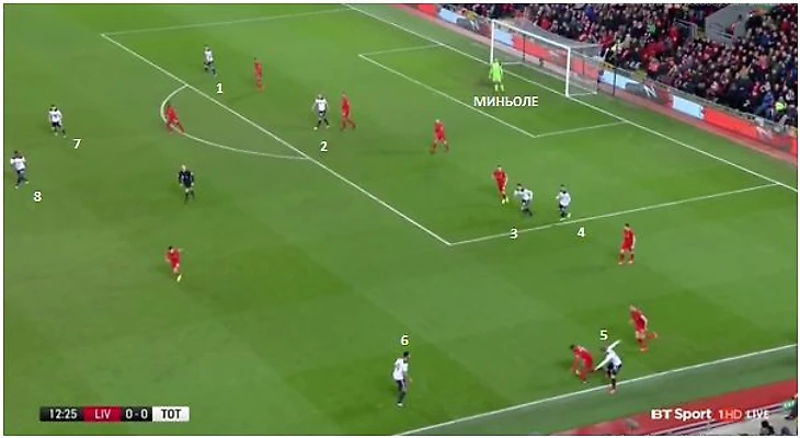 Все вышеперечисленные вещи крайне редко случаются, когда "Ливерпуль" играет с прямыми конкурентами по таблице АПЛ - действующими более открыто, пытающимися создавать множество моментов. Они не упаковывают среднюю линию большим числом игроков, не садятся слишком глубоко, наоборот, стараясь отодвинуть игру от собственной штрафной. Ниже момент из матча против "Тоттенхэма", который атакует достаточно большим количеством игроков, оставляя на своей половине поля Тоби и Вертонгена, а также Уго Льориса.