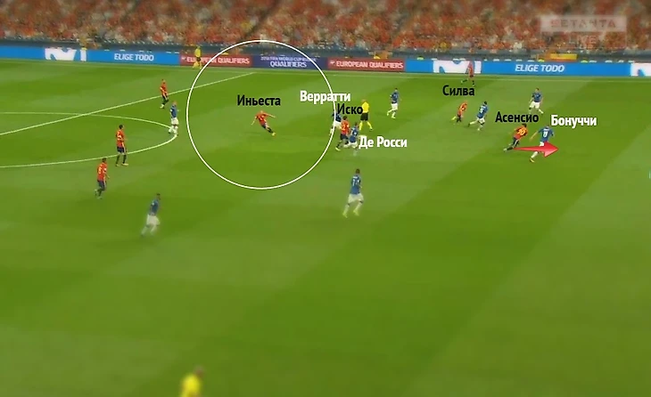 Именно последний стал одним из соавторов первого гола, забитого Иско со штрафного. Момент для Асенсио создал Иньеста своей передачей из глубины на ход молодому мадридцу. Опорники итальянцев не стали прессинговать пасующего, потому что тот отошел слишком глубоко, но и перекрыть зону для передачи они не успевали. В свою очередь, Бардзальи играл по Силве, и фактически в такой ситуации у Бонуччи не было иного выхода, кроме как фолить на Асенсио. Вся четверка атакующих полузащитников Испании расположилась в центральной оси, а их перемещения с мячом и без него вынудили итальянских футболистов оставлять свои позиции. К слову, помогал в такой игре и Коке, что окончательно создавало эффект карусели около штрафной Буффона.