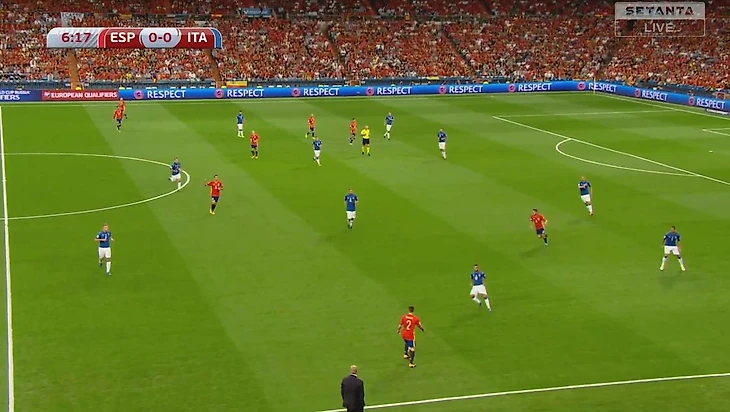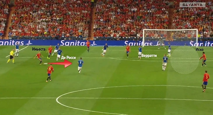 О схеме итальянцев говорит их расположение при испанском контроле мяча, при этом мы видим, как между двумя линиями гостей находится пара атакующих футболистов "ла рохи" - отсутствие чистого форварда фактически означало, что в этом пространстве будет развиваться основная креативная игра хозяев, а заполнять ее будет любой из четверки полузащитников Испании. Кроме того, такая стратегия давала возможность вытягивать с флангов крайних защитников Скуадры Адзурры, и в их зоны должны были активно врываться Альба и, прежде всего, Карвахаль.