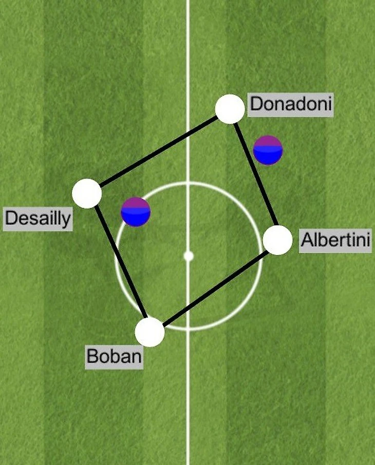 В центре поля у "Милана" расположились четверо полузащитников, местами расстановка менялась на 1-3 в зависимости от движений Десайи. Опорный полузащитник сохранял структуру команды, и игроки вокруг него двигались в зависимости от его расположения. Когда Альбертини получил указание играть выше, в центре поля расстановка "Милана" напоминала ромб, что обеспечило им еще больший контроль.