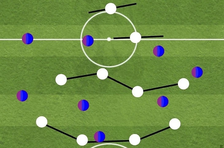 Иными словами, игроки были больше сконцентрированы на мяче, а не на том, чтобы занять свободное пространство. Тем не менее, "Барселона" не использовала забегания игроков в свободные зоны. Это особенно бросалось в глаза, когда вингеры оставались на своих позициях вместо того, чтобы сместиться в центр. На видео ниже сравниваются движения полузащитников "Милана" с передвижениями игроков "Барселоны".
