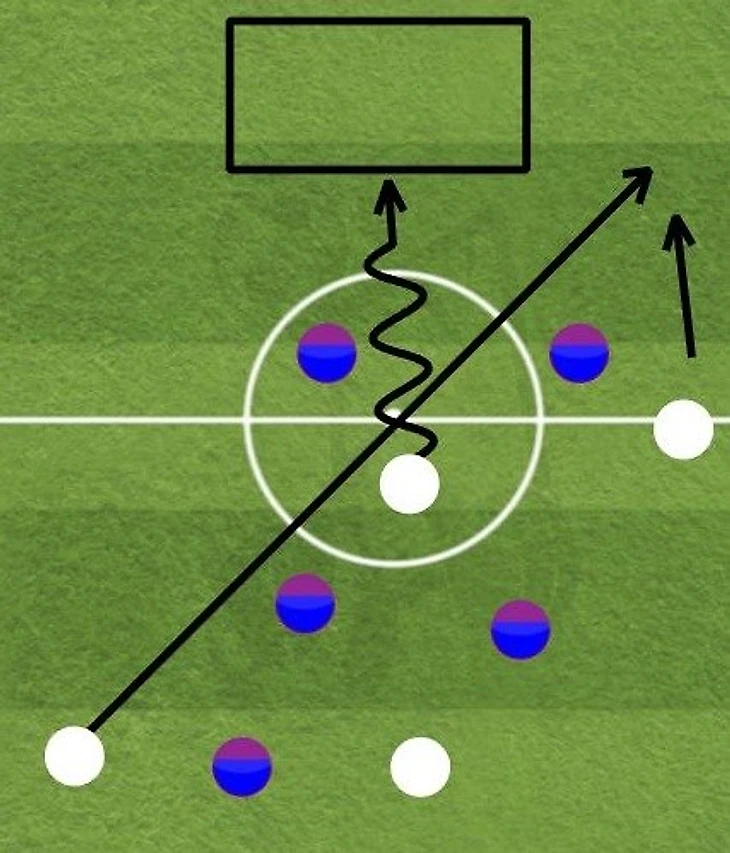 В данном случае центральный полузащитник владеет мячом и делает передачу на выдвинувшегося в атаку правого защитника. Он получает мяч и передает его центральному нападающему, который подключается из центра поля и выполняет движение в зону прямо перед одиннадцатиметровой отметкой. Это еще один пример того, как "Милан" создавал угрозу воротам "Барселоны".