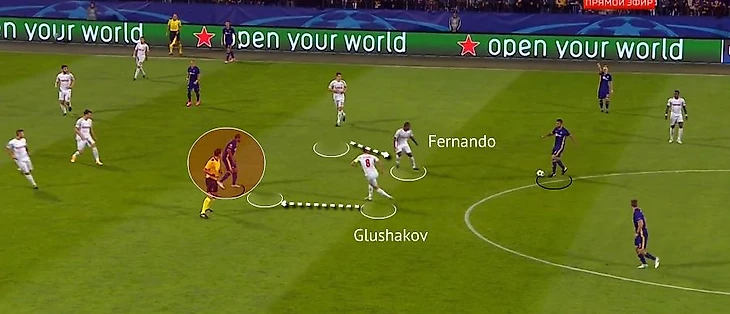 Игра с «Марибором». Фернандо выдвигается в прессинг. Глушаков видит оппонента в зоне между линиями команды и реагирует, отходя назад для персональной опеки