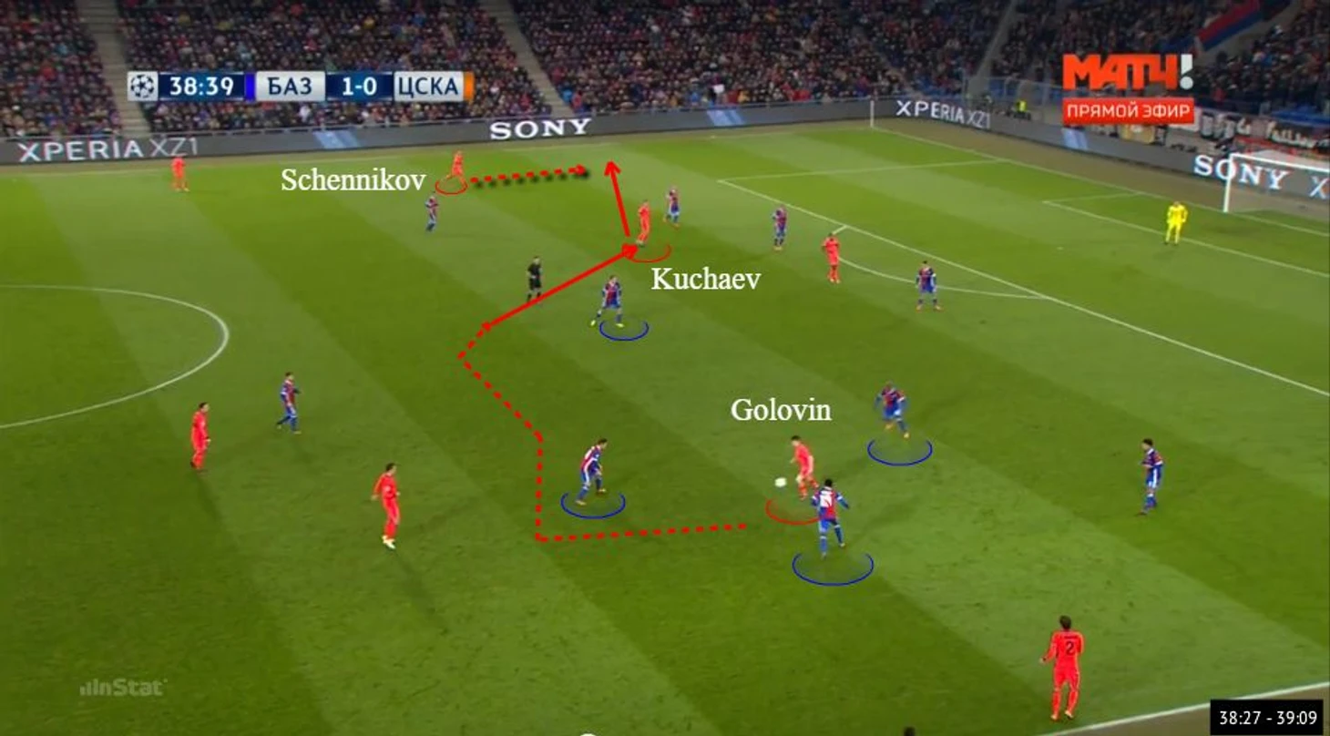 В анализе игры Головина стоит сделать акцент на двух вещах. Во-первых, прессинг «Базеля» был низким после их гола, что диктовалось стратегий. Во-вторых, даже когда команда хотела прессинг организовать, у нее не получалось сгруппироваться в нужных зонах. В результате при отсутствии успешного прессинга и при повышении эффективности ЦСКА в продвижении мяча «Базель», даже пропустив, не сумел вернуться в игру. Во втором тайме гости полностью доминировали. Например, владение хозяев в отрезке с 60-й по 75-ю минуты составило всего 26%.