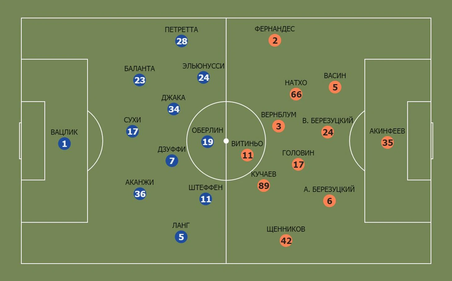Этим часто пользовались Баланта и Аканжи, проникая вглубь территории армейцев. Такие проникновения провоцировали Головина и Кучаева/Витиньо (меняли позиции до перерыва) покидать свои зоны и оставлять Щенникова и Фернандеса в одиночестве против фланговых пар швейцарцев: Петретта – Эльюунусси и Ланг – Штеффен. Чаще хозяева использовали вторую связку (9 кроссов на двоих из 12-ти у команды). Подачи с их фланга были очень опасными для ЦСКА.