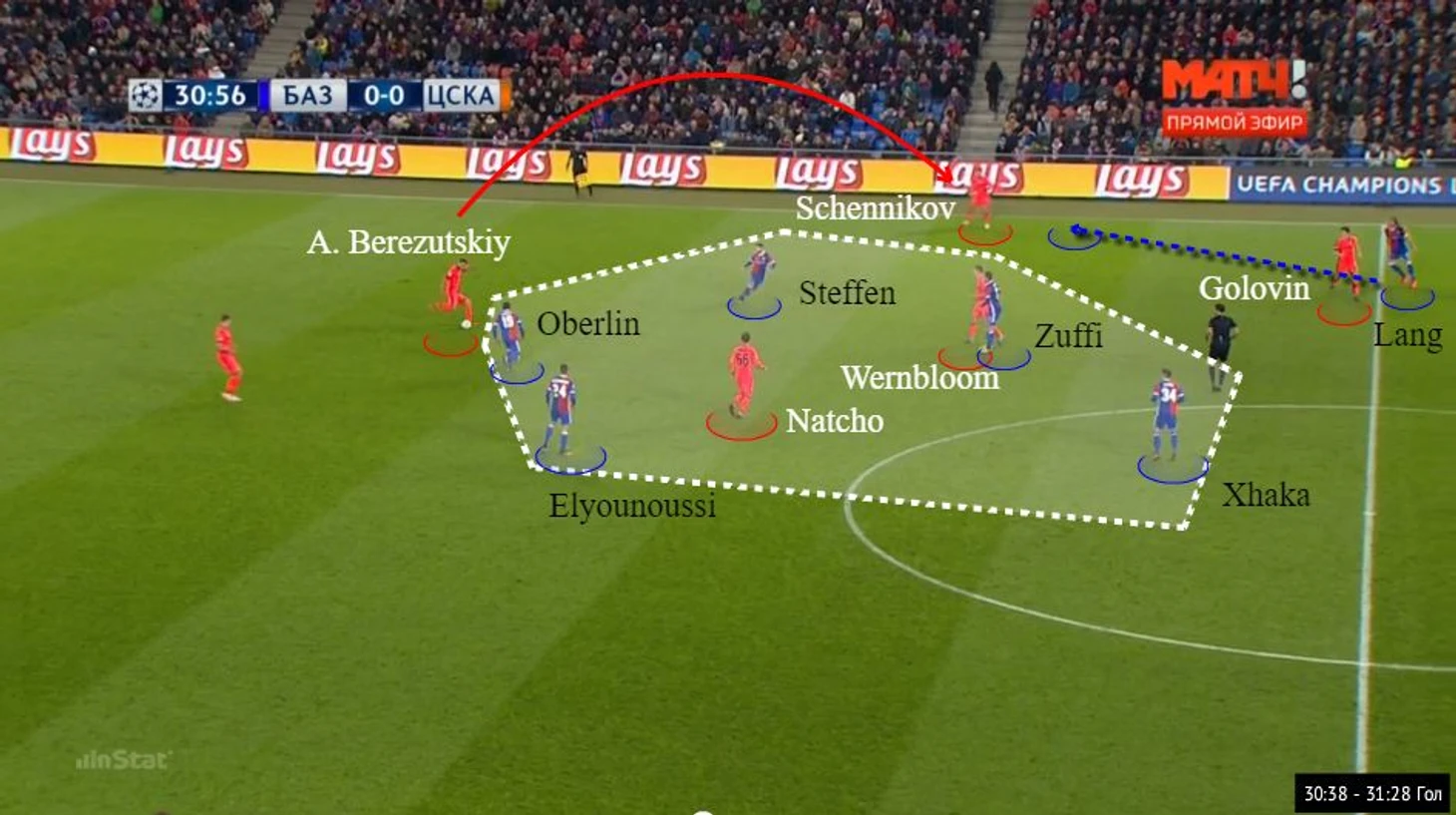 Натхо и Вернблум в «ловушке». Алексей Березуцкий имеет только один вариант продвижения мяча – через Щенникова. Эта передача читается Лангом, который перемещается в сторону Георгия для прессинга. В последующем, навязав борьбу и выиграв подбор, «Базель» провел скоростную голевую атаку