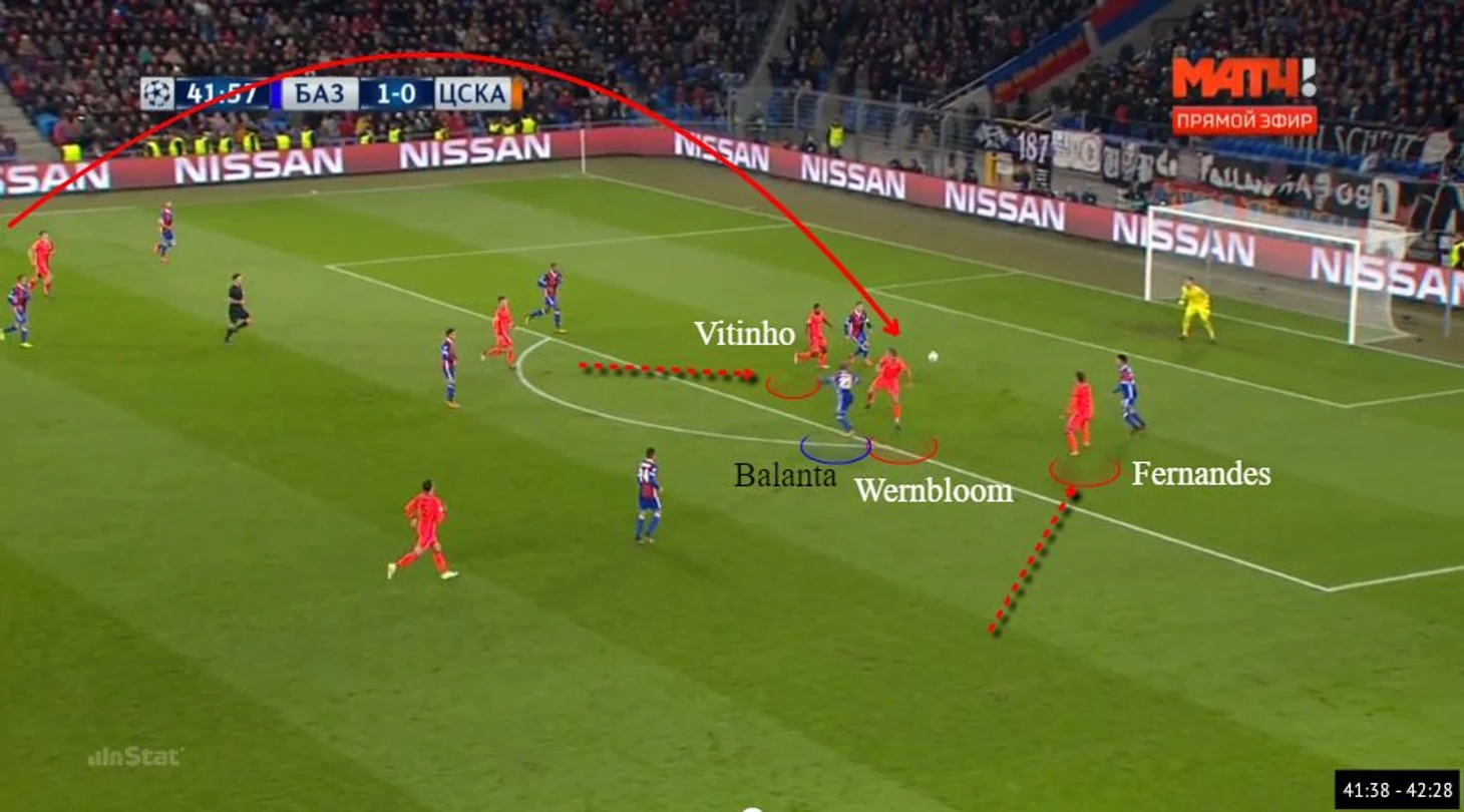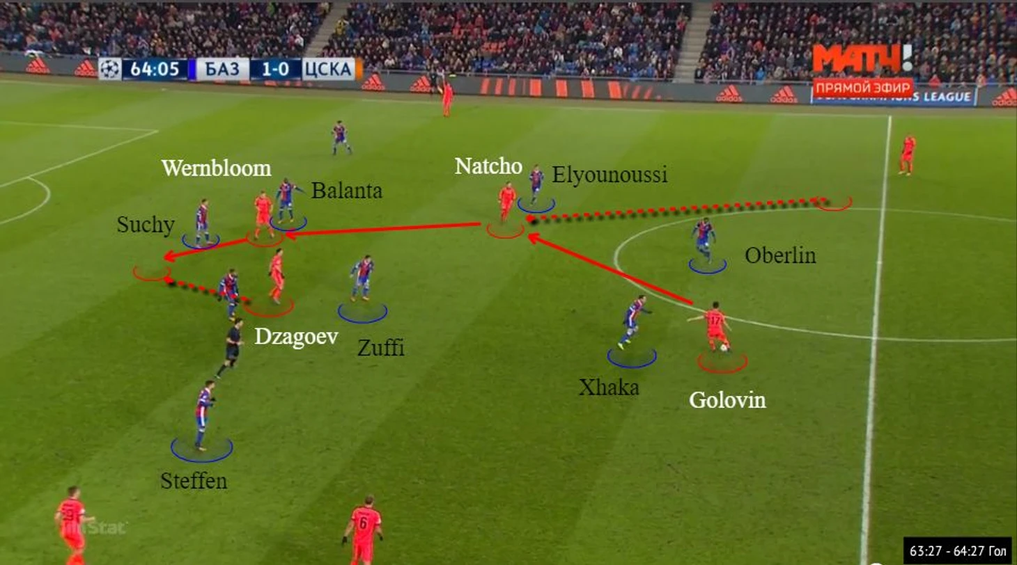 Начало первой голевой атаки ЦСКА. За счет долгого розыгрыша мяча с участием центральных защитников и Головина Натхо улучшил свою атакующую позицию. Продвинувшись с мячом, Головин сориентировал на себя прессинг Джаки. В результате возник коридор в структуре полузащиты «Базеля», где открылся его партнер по полузащите. Последовал пас на Вернблума, силовой заслон шведа и выход один на один от Дзагоева