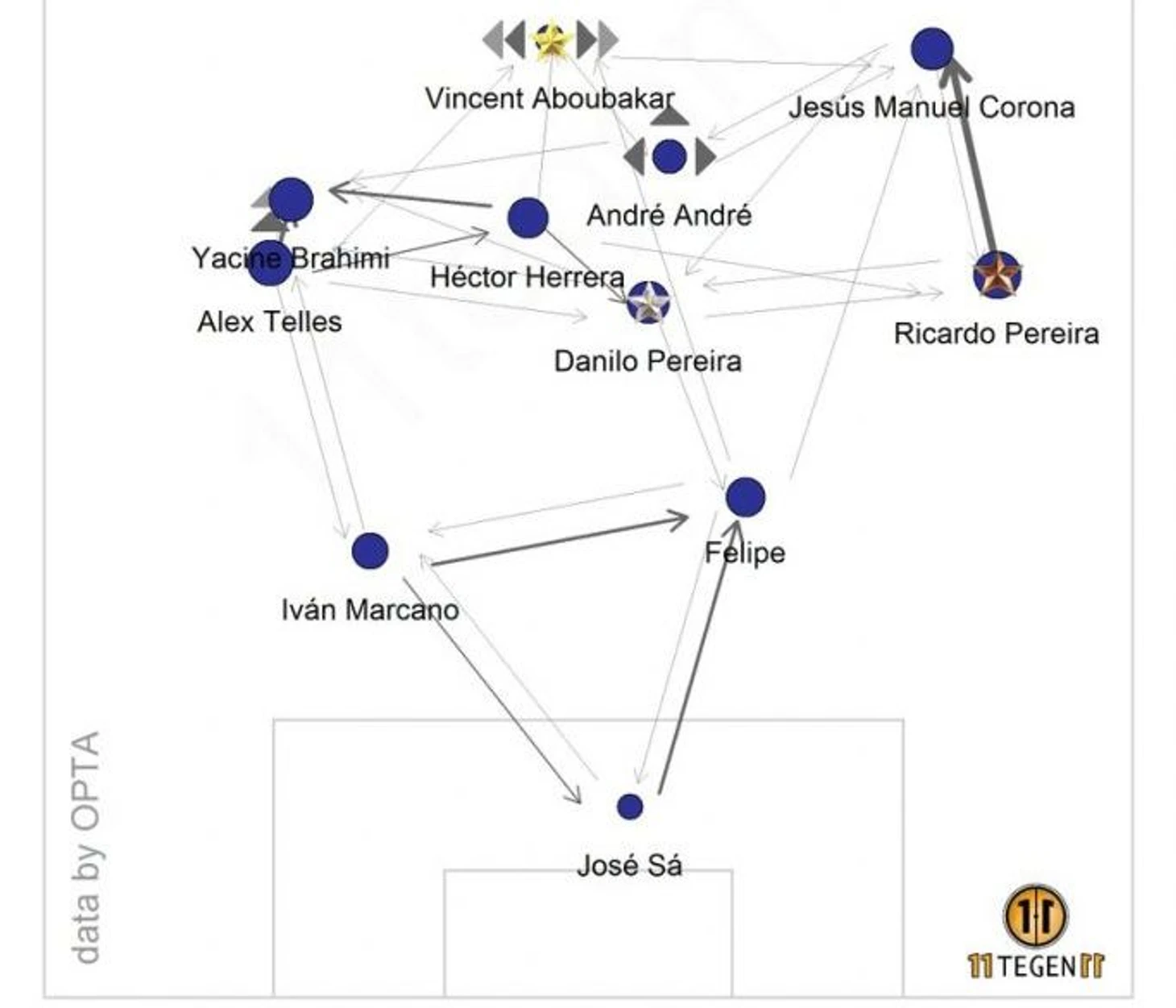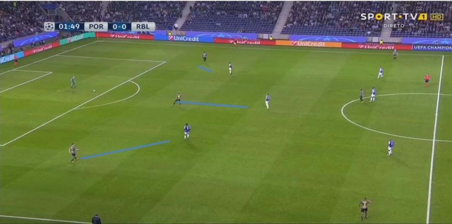 В недавнем матче Лиги чемпионов против "Лейпцига" Консейсау предпочел использовать схему 4-3-3, в которых Сержиу Оливейра либо Андре Андре играли третьего полузащитника, как показано выше. Однако игровая модель в целом была той же.