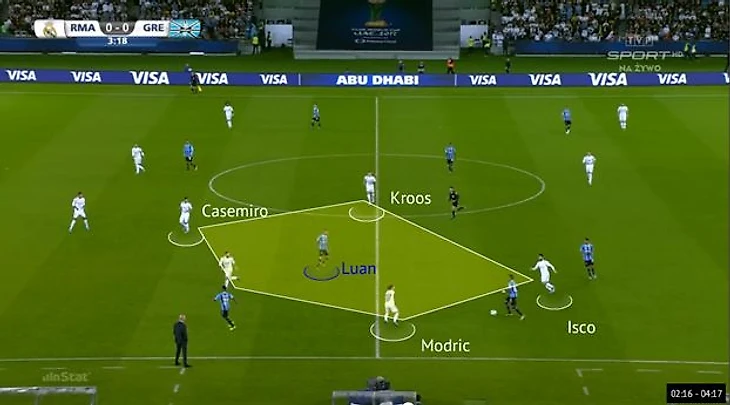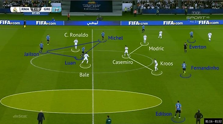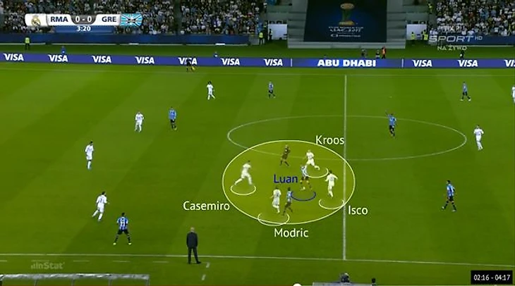 Луан отошел назад для организации атаки. При этом оба опорных полузащитника «Гремио» (Жаилсон и Мишел) – в статичных позициях. Таким образом, команда теряет атакующий баланс и находится в изначально не перспективных позициях для развития атаки против плотной обороны «Реала». Латерали «Гремио» контролируются 1 в 1 Марсело слева и Иско справа, тогда как вариант для движения мяча через центр перекрывает компактный блок центральных полузащитников Модрич-Каземиро-Кроос. Даже если передача на смещающихся «внутрь» поля фланговых нападающих «Гремио» пройдет, она читается за счет игры 1 в 1 защитниками «Реала». Собственно, с перехвата Рамоса после попытки Луана доставить мяч Фернандиньо «сливочные» организовали контратаку через зону в левом полуфланге