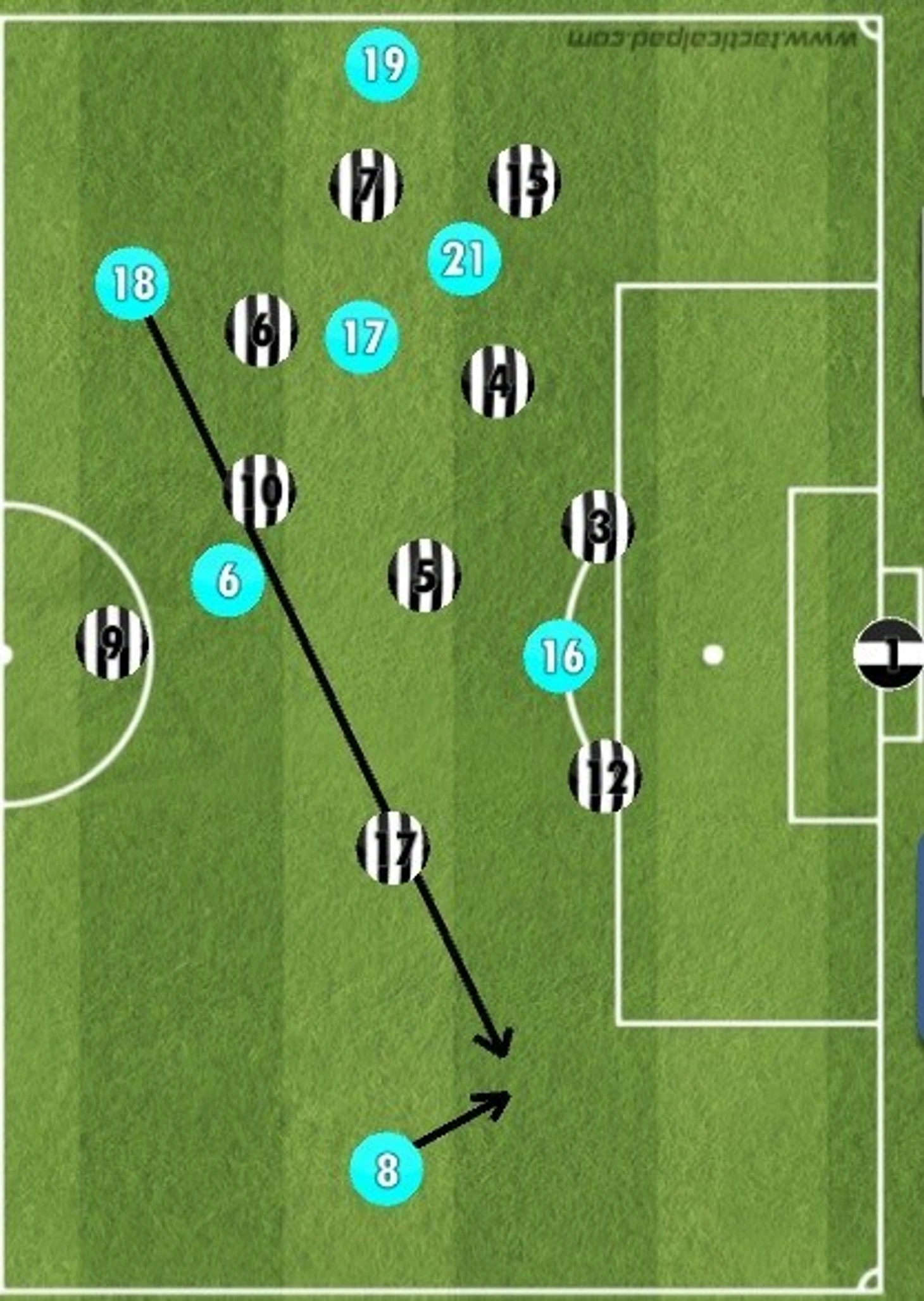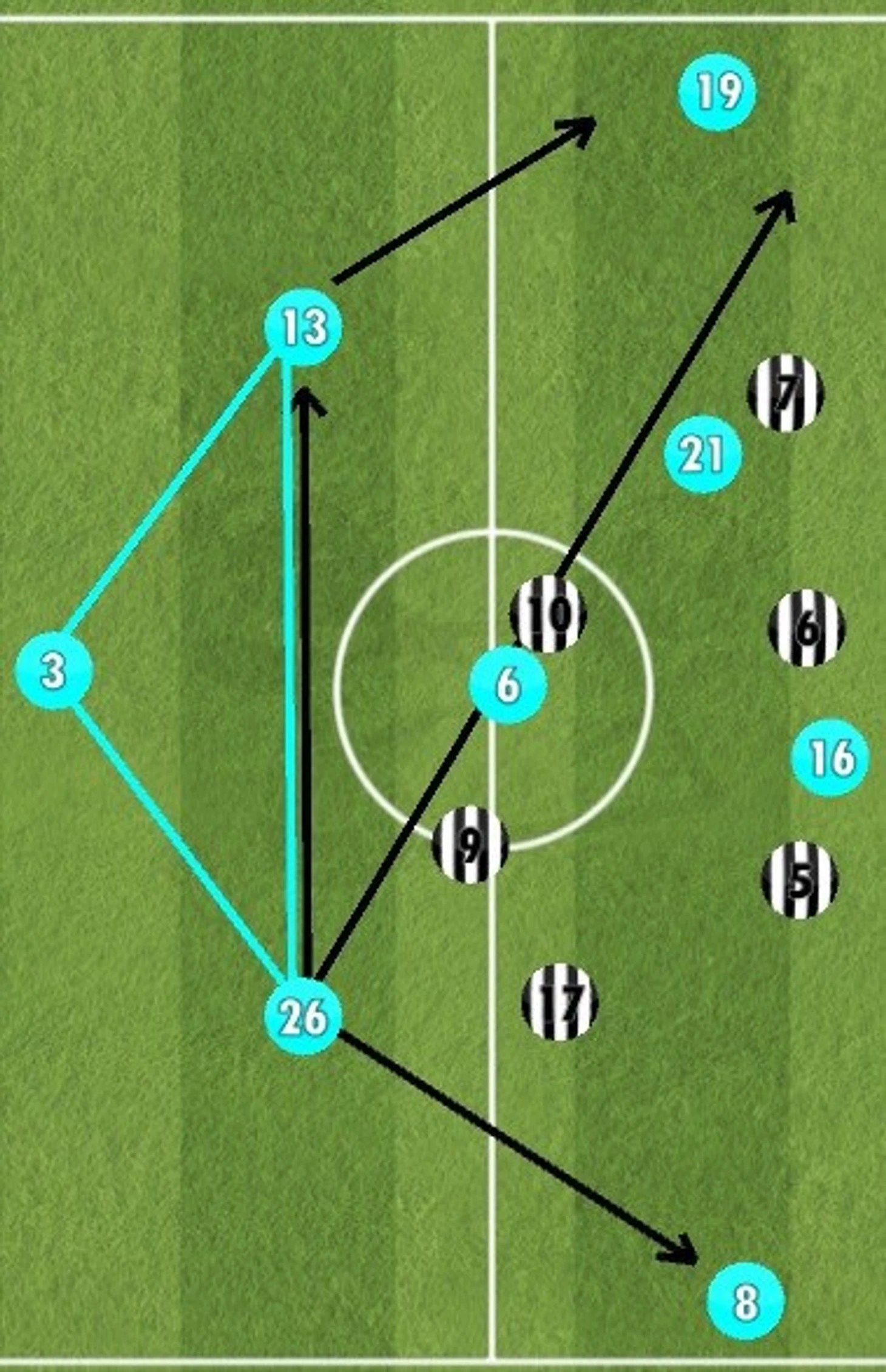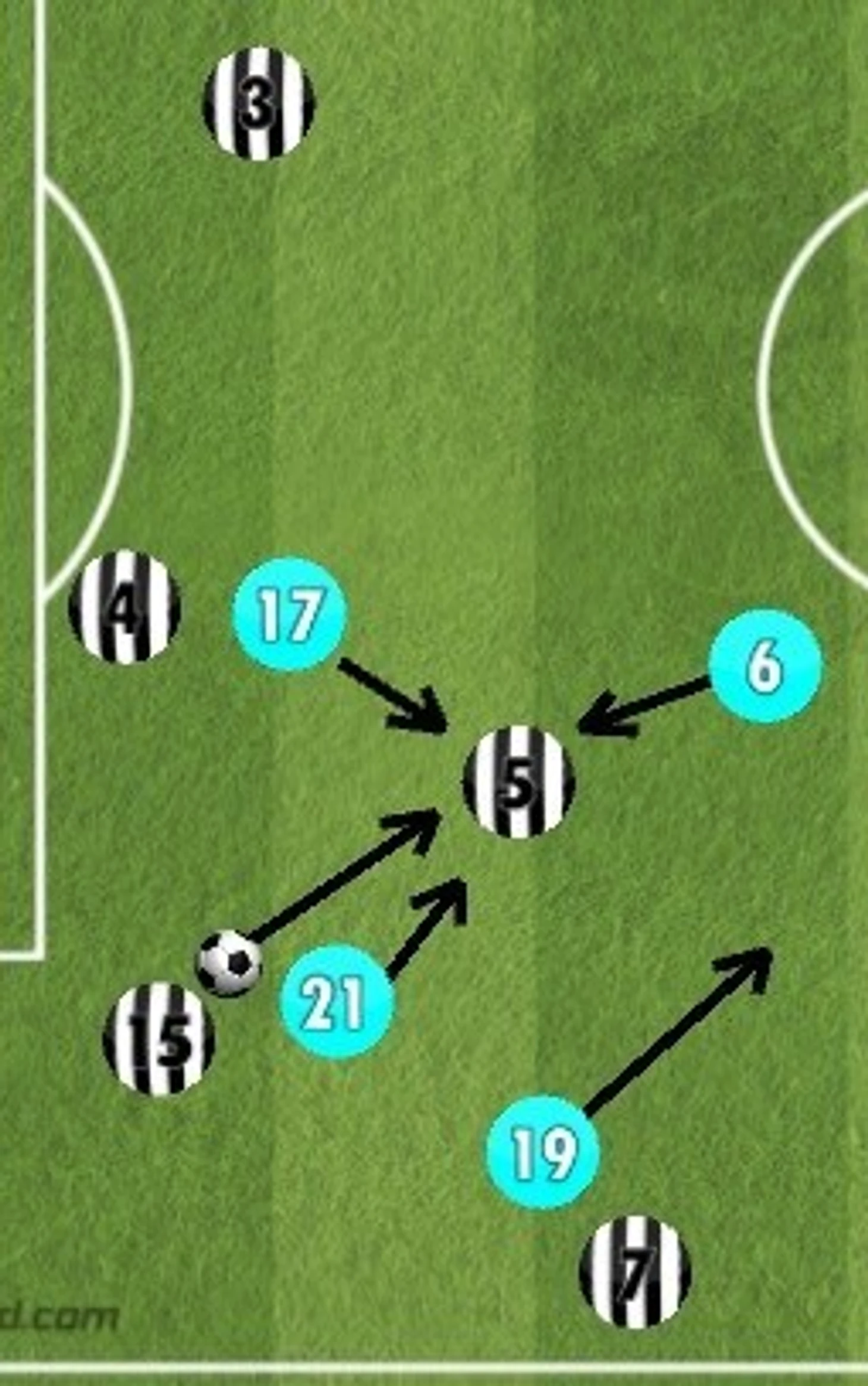 Это еще один пример прессинга римлян: Пьянича прессингуют сразу с трех сторон. Идеальная ситуация для атаки четыре в четыре, в которой позиционное преимущество на стороне "Лацио". Фланговый игрок, который дальше остальных находится от мяча, смещается глубже для того, чтобы перекрыть направление для передач Пьяничу, в случае если тот получит мяч. В результате хавбек туринцев теряет мяч, как только все остальные игроки начинают оказывать на него давление.