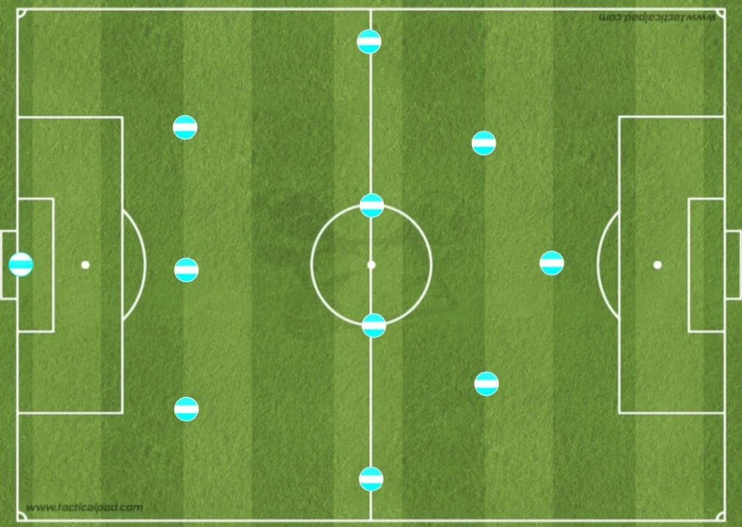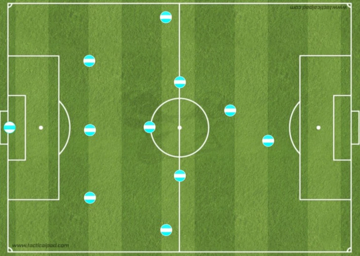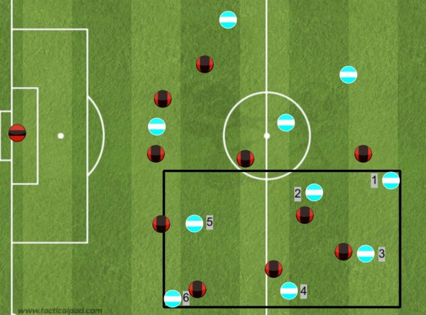 Кроме того, как следует из приведенной схемы, Индзаги не требует от фланговых игроков создавать численное превосходство в середине поля, этим занимаются двое атакующих полузащитников, которые помогают двум центральным. Структура 2-2 в полузащите дает команде численное превосходство над соперником в центре поля.