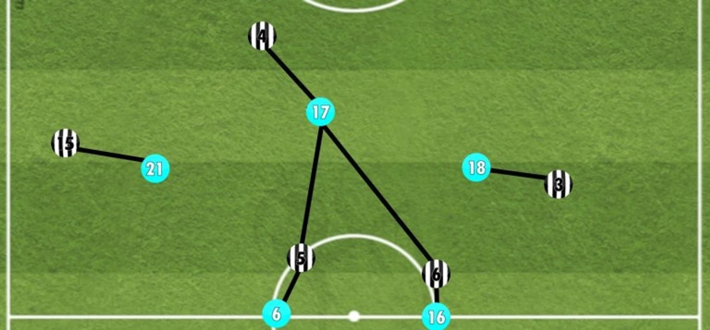 На этом изображении показано, как работает прессинг "Лацио" на чужой половине поля. Линия обороны "Ювентуса" располагается так, чтобы помочь развитию атаки команды, и атакующая группа игроков "Лацио" опекает каждого из них, а центрального защитника с мячом прессингует нападающий "бело-голубых".