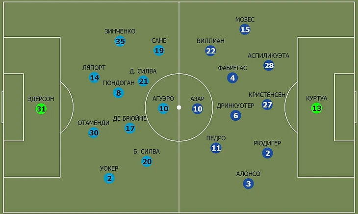 В матче против «Барселоны» у «Челси» получалось контратаковать за счет индивидуальных действий атакующей тройки, а самые опасные моменты возникали из-за того, что игроки каталонского клуба оставляли Виллиана одного на границе штрафной и позволяли спокойно бить. «Сити» же напрочь выключил из игры Азара и особенно Виллиана (у бразильца всего 22 касания и 7 передач, меньше всех в матче). У Педро же игра не пошла.