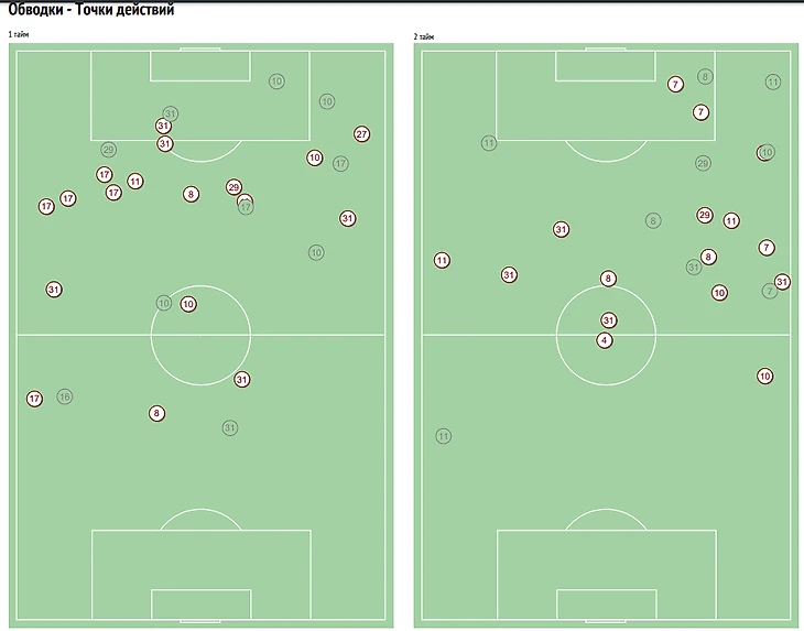 За счет такой методики «РБ» мог иметь по итогу гораздо больше шансов, если бы не качественная позиционная игра и игра на перехватах центральных защитников «Зенита» (Маммана – 13, Мевля – 9). Передачи на вбегающего игрока они читали и часто контролировали ситуацию. Однако с ситуациями 2 в 1 и при выпадах в отбор не справлялись, что собственно и проявилось в случае с первым голом хозяев.