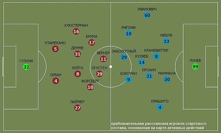 И Ригони, и Кузяев (и на отрезке начала второго тайма Кокорин) садились слишком глубоко, чтобы не допускать «перегруза» соперником зон Кришито и Ивановича. Если «Лейпциг» уводил слишком глубоко по флангу крайних полузащитников «Зенита», то получал достаточно много территории в полуфланге и центре, создавая локальный численный перевес против Краневиттера и Ерохина за счет кооперации Кейта и Демме с Форсбергом или нападающими.