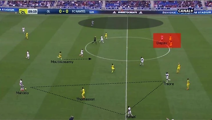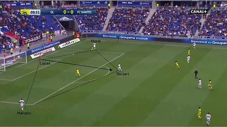 Грамотное расположение игроков "Лиона" и численное превосходство в центре обеспечили Марсело большее количество вариантов. Он может изменить расположение игроков, вернув мяч Тузару. Опорник гостей Мутуссами в таком случае вынужден будет вернуться назад, что перекрыть направления для передач в центр. Кроме того, Марсело может использовать "треугольник", который он образует вместе с Рафаэлем и Траоре. Полузащитник гостей Томассон по логике должен перекрыть линию передач на Рафаэля и прессинговать при этом Марсело. Так, в зоне Траоре появляется свободное пространство между защитниками, которым и пользуется бразильский латераль хозяев.