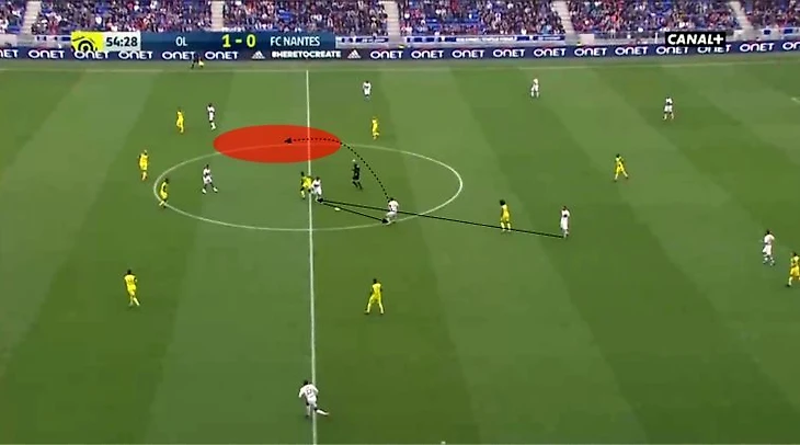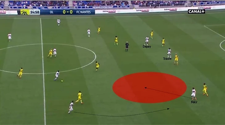 Фекир выдвигается со своей позиции, чтобы перейти на схему 4-3-3. Депай все еще находится между крайним и центральным защитниками, в то время как Траоре ожидает паса в центре. Недостаточно компактное расположение игроков "Нанта" дает "Лиону" возможность задействовать фланги. Ндомбеле может передать мяч в зону, выделенную на картинке красным цветом.