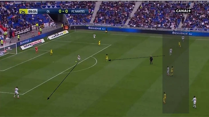 Передачи на фланги были важны для "Лиона" тем, что за счет них у хозяев появлялось пространство в центре поля. Именно поэтому они часто создавали атаки с помощью диагональных передач крайних защитников на нападающих, либо использовали численное преимущество и свободное пространство в центре поля, которое у них было ввиду недостаточно компактного расположения игроков "Нанта".