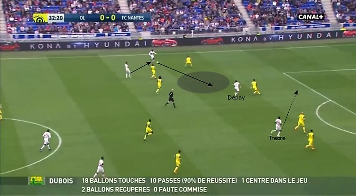 При этом важно, чтобы Ауар находился между линиями, потому что это осложняет задачу игрокам обороны, и он может легко сыграть в одно касание на Менди. Кроме того, Депай и Траоре не позволили защитникам "Нанта" выдвинуться вперед со своих позиций, благодаря чему Ауар получил время для того, чтобы развернуться с мячом.