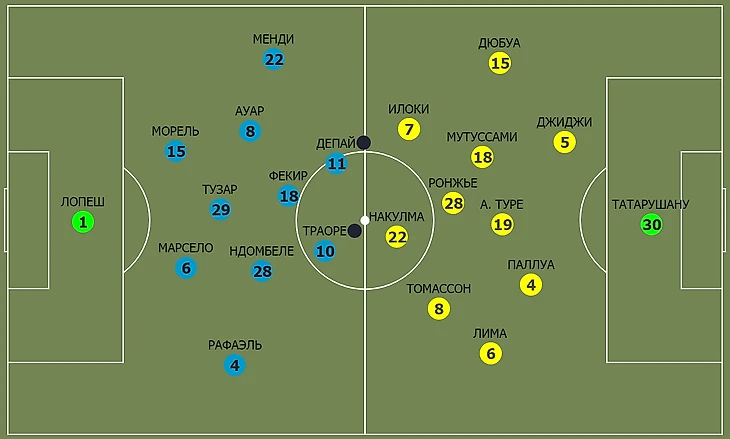 При создании атак "Лион" опирался на "даймонд", который сформировали двое центральных защитников, хавбек Люка Тузар и вратарь Антони Лопеш.