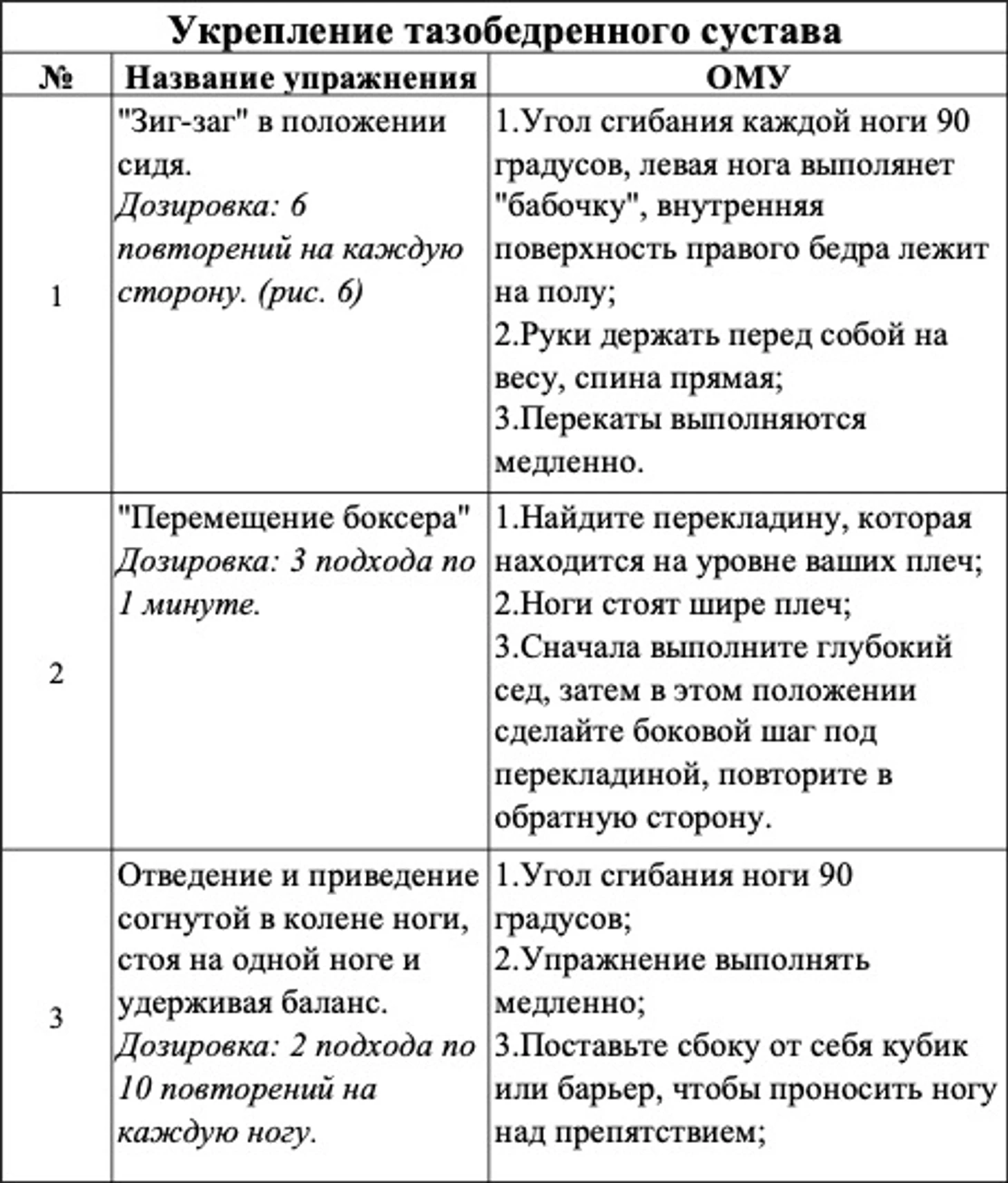 4. Проделать курс укрепляющих упражнений на тазобедренный сустав, чтобы максимально отложить его последующее смещение (таблица 1).