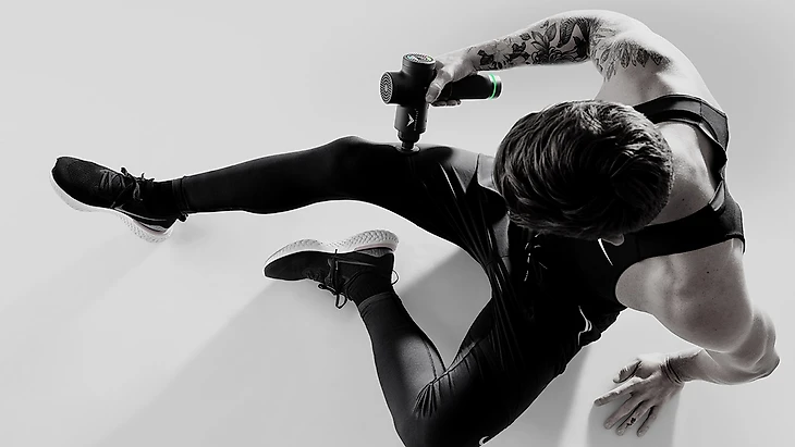3. Раскатывать подвздошно-большеберцовый тракт мячом для МФР (рис.3) или роллом (рис.4)/ разбивать перкуссионным массажером (рис.5);