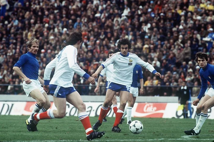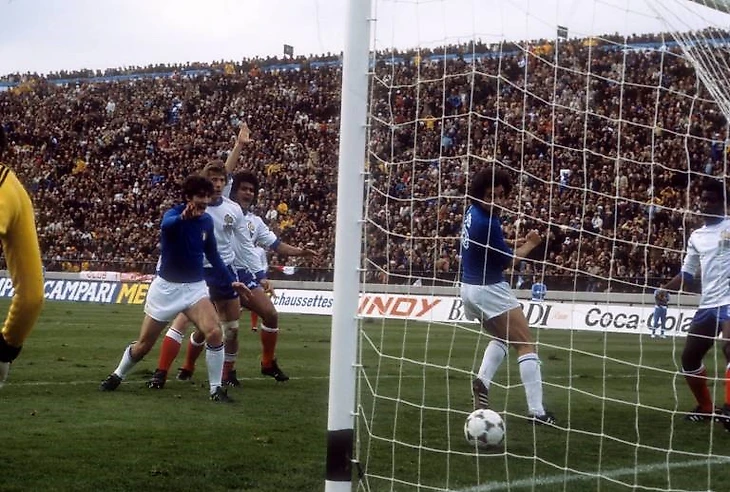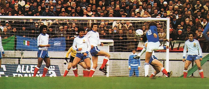 1-я минута. Анри Мишель подключает в атаку по левому флангу Дидье Сикса. Тот, подобно породистому рысаку опережает в забеге Клаудио Джентиле, затем как от стоячего уходит от Гаэтано Ширеа, и в нескольких метрах от углового флажка делает шикарный навес в центр штрафной площади итальянцев. Мяч перелетает Марио Беллуджи и Бернар Лякомб, в высоком прыжке, метров с девяти, ударом головой красиво укладывает его впритирку с правой штангой. 0:1