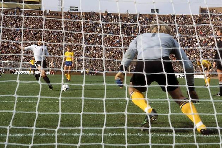 42-я минута. Рой Андерссон из глубины отдает вертикальный пас к радиусу штрафной на Леннарта Ларссона, а тот в касание отыгрывает вправо на Торстенссона. Шведский полузащитник доходит с мячом почти до лицевой линии и делает передачу верхом на ближний угол вратарской. Шёберг пытается в падении пробить головой по воротам, но не попадает по мячу и Пеццай бедром выносит его из штрафной, где его тут же подбирает Прохазка и начинает быструю контратаку австрийцев. Дойдя до центра поля, Прохазка, автор одного из послематчевых пенальти в ворота московского «Динамо» в полуфинале Кубка Обладателей Кубков, отдает пас в свободную зону на Кранкля. Форвард «Рапида» входит с левого угла в штрафную, пробрасывает мяч мимо Нордквиста и начинает оббегать его с левой стороны. Шведский защитник ставит ему корпус и Кранкль падает на газон. В современном футболе, скорее всего, Кранкль был бы наказан за нырок в стиле Неймара, но тогда, сорок лет назад, голландский рефери матча Чарльз Корвер указал на 11-метровую отметку.